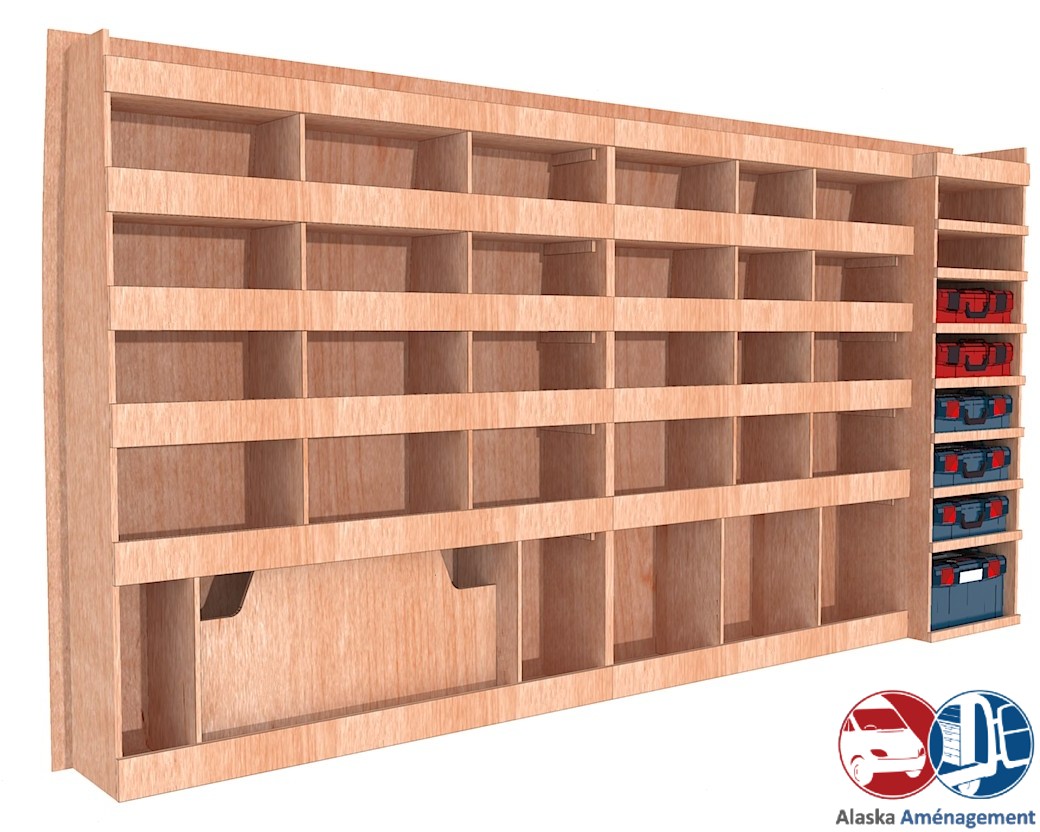 Ce meuble de rangement KRMG-N (pour le latéral « Gauche » de votre véhicule) offre une solution de stockage polyvalente et fonctionnelle avec six niveaux de stockage. Il comprend des étagères  et un module spécifique pour les mallettes d’électroportatif. Une étagère supérieure est conçue pour les objets longs. Son fond arrière intégré assure la rigidité et protège la carrosserie du véhicule, évitant un habillage supplémentaire. Le meuble est disponible en contreplaqué brut ou filmé.