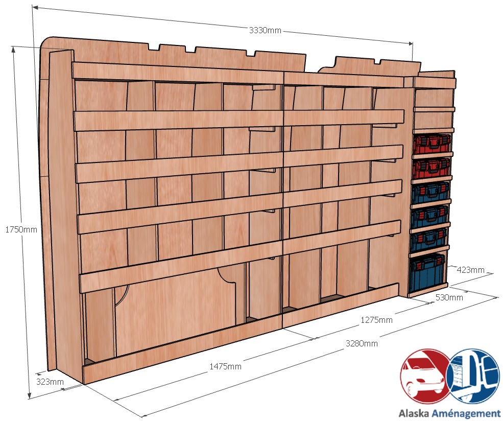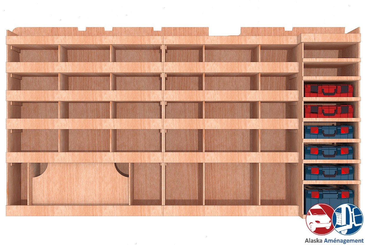 Ce meuble de rangement KRMG-N (pour le latéral « Gauche » de votre véhicule) offre une solution de stockage polyvalente et fonctionnelle avec six niveaux de stockage. Il comprend des étagères et un module spécifique pour les mallettes d’électroportatif. Une étagère supérieure est conçue pour les objets longs. Son fond arrière intégré assure la rigidité et protège la carrosserie du véhicule, évitant un habillage supplémentaire. Le meuble est disponible en contreplaqué brut ou filmé. |