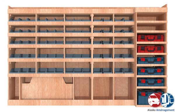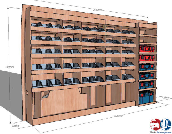 Ce meuble de rangement KRMG001-N (pour le latéral « Gauche » de votre véhicule) offre une solution de stockage polyvalente et fonctionnelle avec sept niveaux de stockage. Il comprend des étagères pour bacs à bec  et un module spécifique pour les mallettes d’électroportatif. Une étagère supérieure est conçue pour les objets longs. Son fond arrière intégré assure la rigidité et protège la carrosserie du véhicule, évitant un habillage supplémentaire. Le meuble est disponible en contreplaqué brut ou filmé.