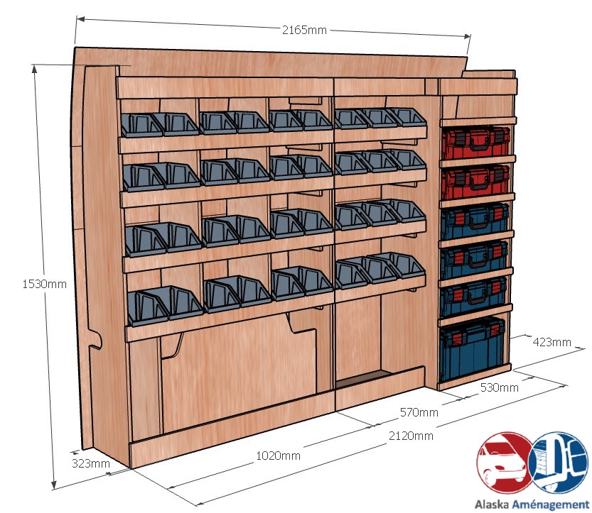 Rangement rapide avec bacs à bec et espace pour mallettes, pensé pour les artisans mobiles.