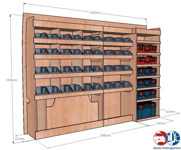 Ce meuble de rangement KRMG001-N (pour le latéral « Gauche » de votre véhicule) offre une solution de stockage polyvalente et fonctionnelle avec six niveaux de stockage. Il comprend des étagères pour bacs à bec  et un module spécifique pour les mallettes d’électroportatif. Une étagère supérieure est conçue pour les objets longs. Son fond arrière intégré assure la rigidité et protège la carrosserie du véhicule, évitant un habillage supplémentaire. Le meuble est disponible en contreplaqué brut ou filmé.
