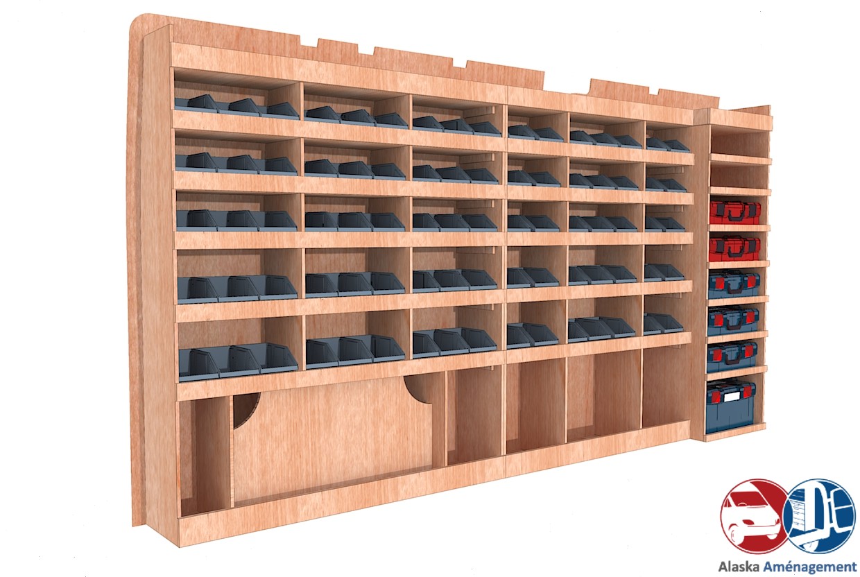 Ce meuble de rangement KRMG001-N(pour le latéral « Gauche » de votre véhicule) offre une solution de stockage polyvalente et fonctionnelle avec sept niveaux de stockage. Il comprend des étagères pour bacs à bec et un module spécifique pour les mallettes d’électroportatif. Une étagère supérieure est conçue pour les objets longs. Son fond arrière intégré assure la rigidité et protège la carrosserie du véhicule, évitant un habillage supplémentaire. Le meuble est disponible en contreplaqué brut ou filmé.
