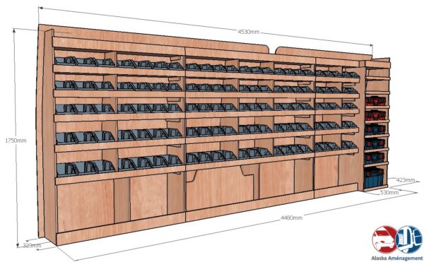 Ce meuble de rangement KRMG001-N (pour le latéral « Gauche » de votre véhicule) offre une solution de stockage polyvalente et fonctionnelle avec sept niveaux de stockage. Il comprend des étagères pour bacs à bec  et un module spécifique pour les mallettes d’électroportatif. Une étagère supérieure est conçue pour les objets longs. Son fond arrière intégré assure la rigidité et protège la carrosserie du véhicule, évitant un habillage supplémentaire. Le meuble est disponible en contreplaqué brut ou filmé.
