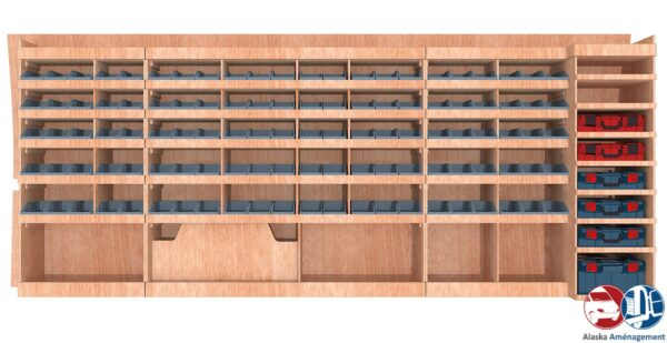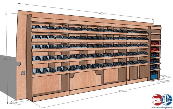Ce meuble de rangement KRMG001-N (pour le latéral « Gauche » de votre véhicule) offre une solution de stockage polyvalente et fonctionnelle avec sept niveaux de stockage. Il comprend des étagères pour bacs à bec  et un module spécifique pour les mallettes d’électroportatif. Une étagère supérieure est conçue pour les objets longs. Son fond arrière intégré assure la rigidité et protège la carrosserie du véhicule, évitant un habillage supplémentaire. Le meuble est disponible en contreplaqué brut ou filmé.