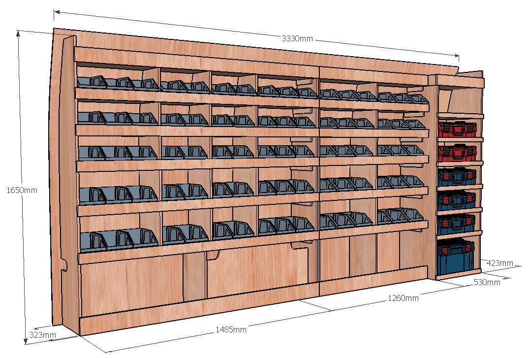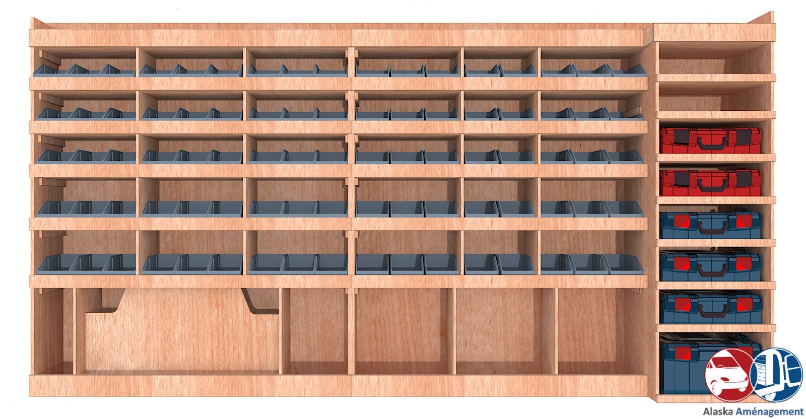 | Rangement rapide avec bacs à bec et espace pour mallettes, pensé pour les artisans mobiles.