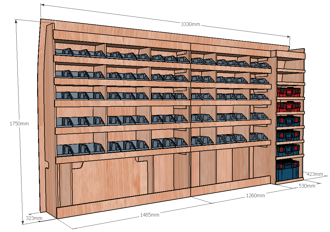 Ce meuble de rangement KRMG001-N (pour le latéral « Gauche » de votre véhicule) offre une solution de stockage polyvalente et fonctionnelle avec sept niveaux de stockage. Il comprend des étagères pour bacs à bec et un module spécifique pour les mallettes d’électroportatif. Une étagère supérieure est conçue pour les objets longs. Son fond arrière intégré assure la rigidité et protège la carrosserie du véhicule, évitant un habillage supplémentaire. Le meuble est disponible en contreplaqué brut ou filmé. |