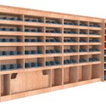 Ce meuble de rangement KRMG001-N (pour le latéral « Gauche » de votre véhicule) offre une solution de stockage polyvalente et fonctionnelle avec sept niveaux de stockage. Il comprend des étagères pour bacs à bec  et un module spécifique pour les mallettes d’électroportatif. Une étagère supérieure est conçue pour les objets longs. Son fond arrière intégré assure la rigidité et protège la carrosserie du véhicule, évitant un habillage supplémentaire. Le meuble est disponible en contreplaqué brut ou filmé.