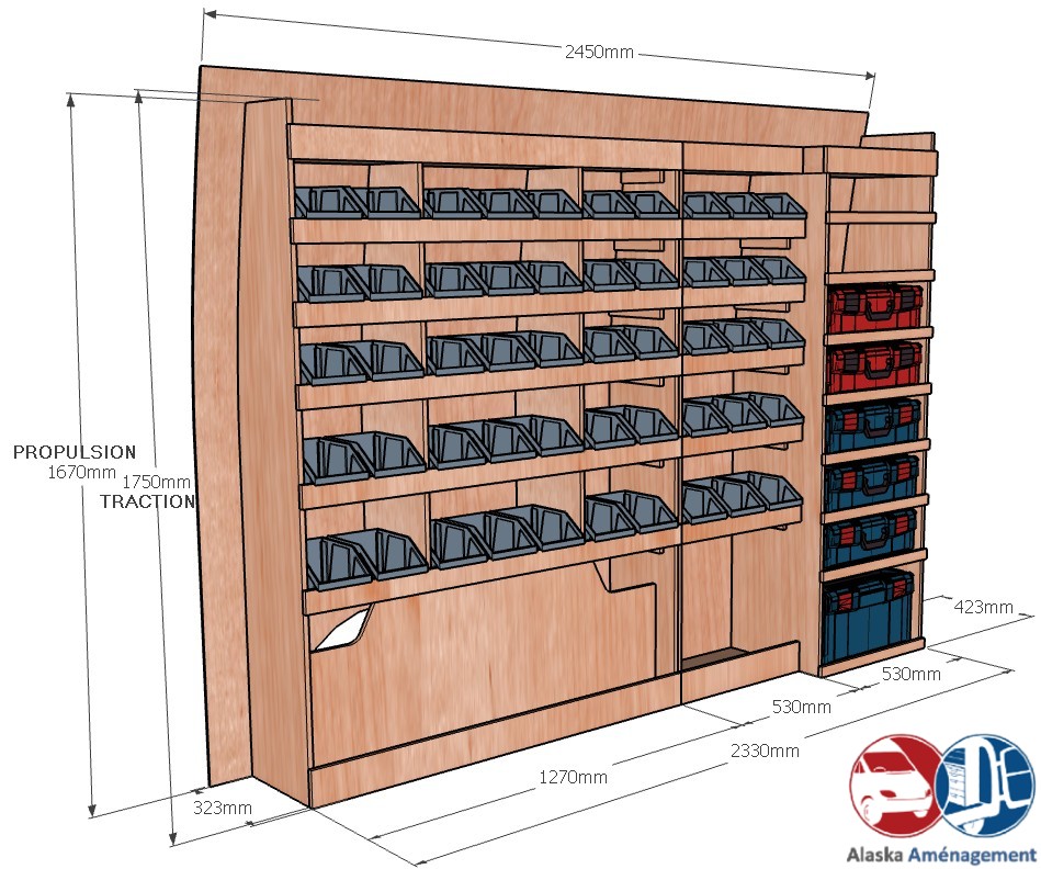Ce meuble de rangement KRMG001-N (pour le latéral « Gauche » de votre véhicule) offre une solution de stockage polyvalente et fonctionnelle avec six niveaux de stockage. Il comprend des étagères pour bacs à bec et un module spécifique pour les mallettes d’électroportatif. Une étagère supérieure est conçue pour les objets longs. Son fond arrière intégré assure la rigidité et protège la carrosserie du véhicule, évitant un habillage supplémentaire. Le meuble est disponible en contreplaqué brut ou filmé. |