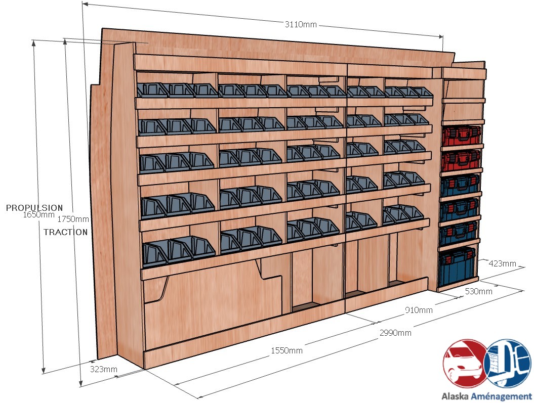 Rangement rapide avec bacs à bec et espace pour mallettes, pensé pour les artisans mobiles.