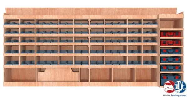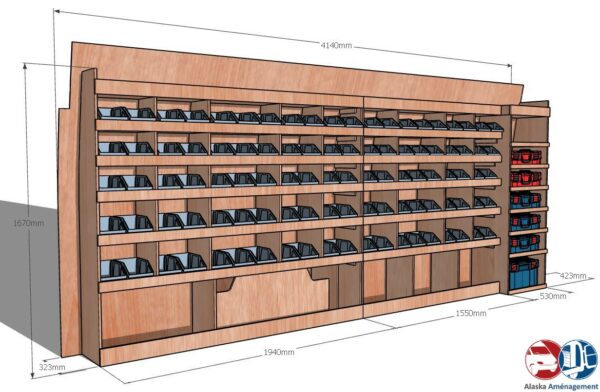 Ce meuble de rangement KRMG001-N (pour le latéral « Gauche » de votre véhicule) offre une solution de stockage polyvalente et fonctionnelle avec sept niveaux de stockage. Il comprend des étagères pour bacs à bec  et un module spécifique pour les mallettes d’électroportatif. Une étagère supérieure est conçue pour les objets longs. Son fond arrière intégré assure la rigidité et protège la carrosserie du véhicule, évitant un habillage supplémentaire. Le meuble est disponible en contreplaqué brut ou filmé.