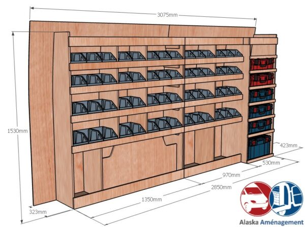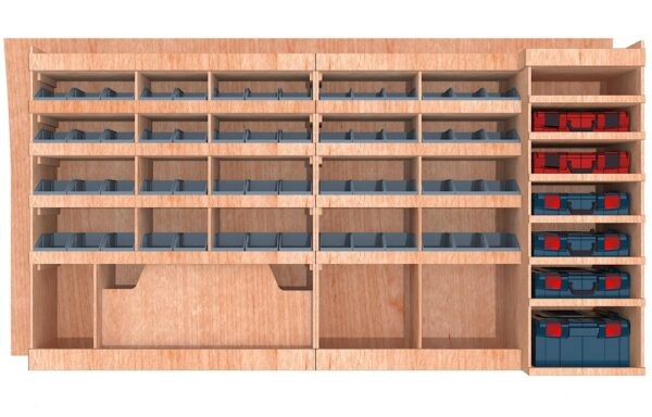 Ce meuble de rangement KRMG001-N (pour le latéral « Gauche » de votre véhicule) offre une solution de stockage polyvalente et fonctionnelle avec six niveaux de stockage. Il comprend des étagères pour bacs à bec  et un module spécifique pour les mallettes d’électroportatif. Une étagère supérieure est conçue pour les objets longs. Son fond arrière intégré assure la rigidité et protège la carrosserie du véhicule, évitant un habillage supplémentaire. Le meuble est disponible en contreplaqué brut ou filmé.