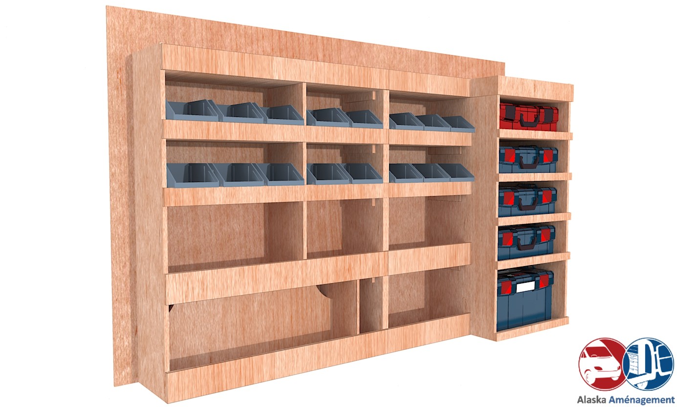 Rangement rapide avec bacs à bec et espace pour mallettes, pensé pour les artisans mobiles.