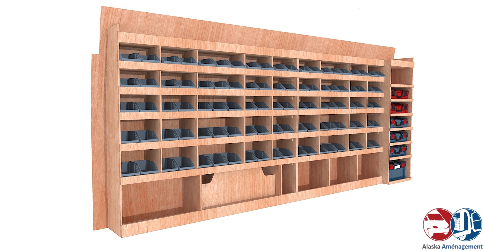 Ce meuble de rangement KRMG001-N(pour le latéral « Gauche » de votre véhicule) offre une solution de stockage polyvalente et fonctionnelle avec sept niveaux de stockage. Il comprend des étagères pour bacs à bec et un module spécifique pour les mallettes d’électroportatif. Une étagère supérieure est conçue pour les objets longs. Son fond arrière intégré assure la rigidité et protège la carrosserie du véhicule, évitant un habillage supplémentaire. Le meuble est disponible en contreplaqué brut ou filmé.
