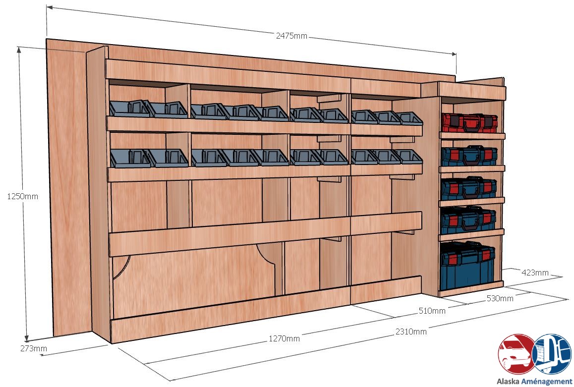 | Rangement rapide avec bacs à bec et espace pour mallettes, pensé pour les artisans mobiles.