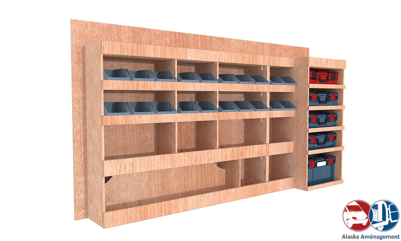 Rangement rapide avec bacs à bec et espace pour mallettes, pensé pour les artisans mobiles.