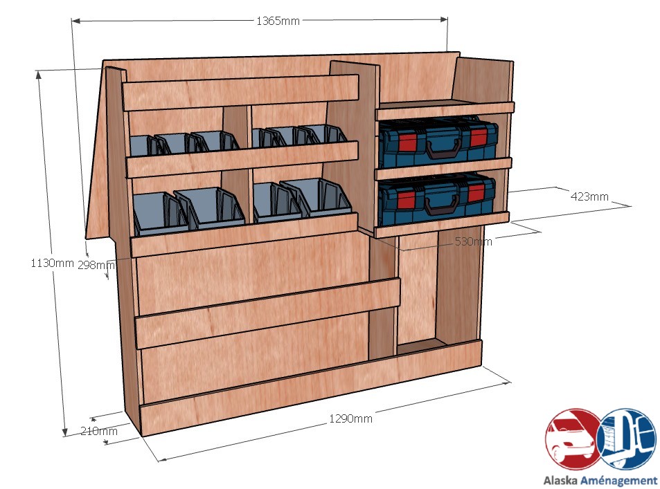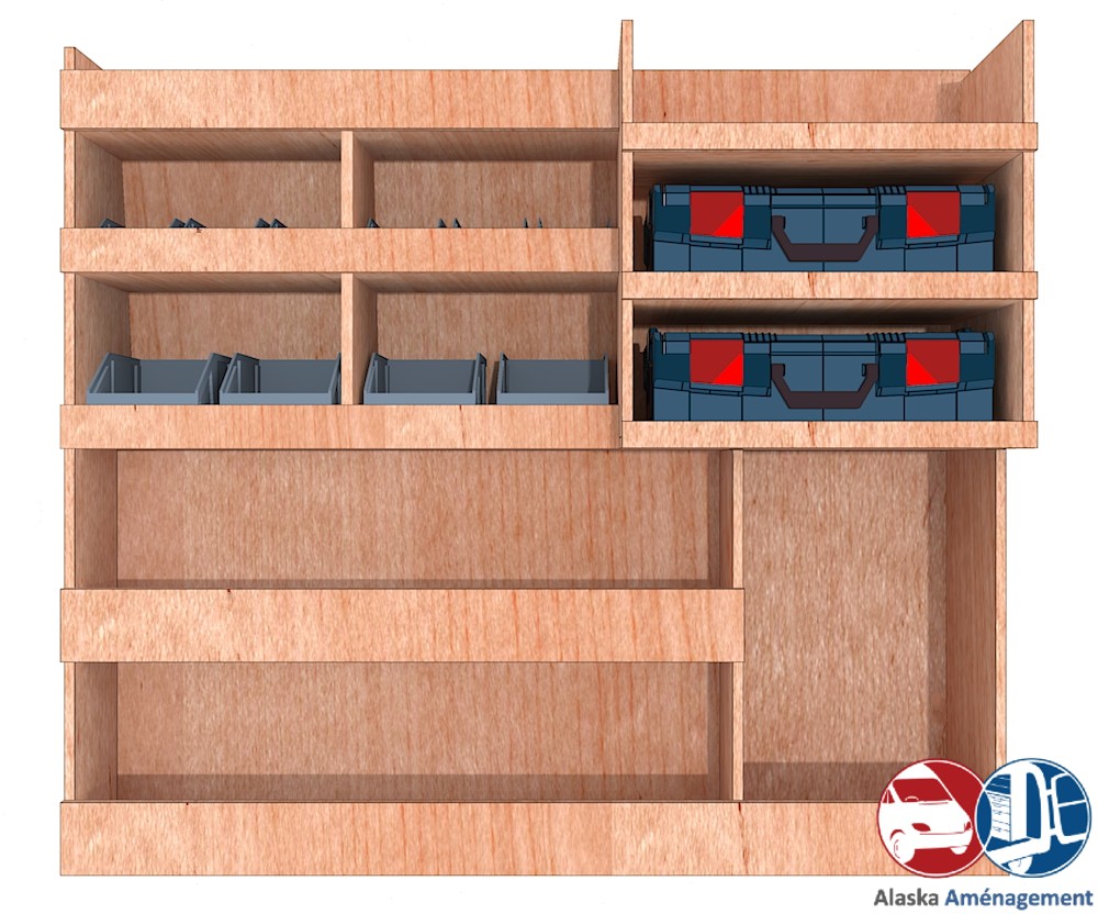 | Rangement rapide avec bacs à bec et espace pour mallettes, pensé pour les artisans mobiles.