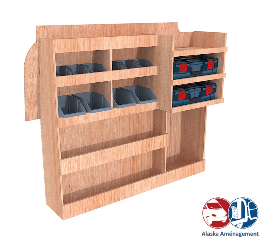 Rangement rapide avec bacs à bec et espace pour mallettes, pensé pour les artisans mobiles.