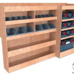 Ce meuble de rangement KRMG001-N (pour le latéral « Gauche » de votre véhicule) offre une solution de stockage polyvalente et fonctionnelle avec cinq niveaux de stockage. Il comprend des étagères pour bacs à bec  et un module spécifique pour les mallettes d’électroportatif. Une étagère supérieure est conçue pour les objets longs. Son fond arrière intégré assure la rigidité et protège la carrosserie du véhicule, évitant un habillage supplémentaire. Le meuble est disponible en contreplaqué brut ou filmé.
