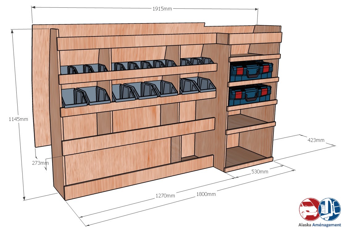 Rangement rapide avec bacs à bec et espace pour mallettes, pensé pour les artisans mobiles.