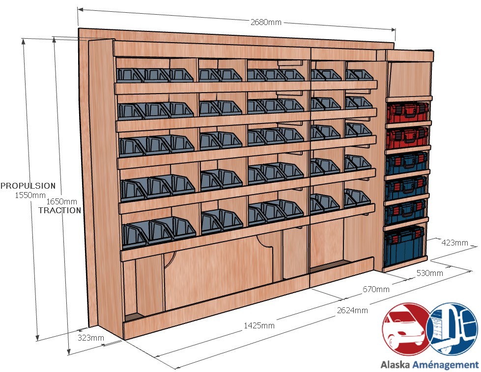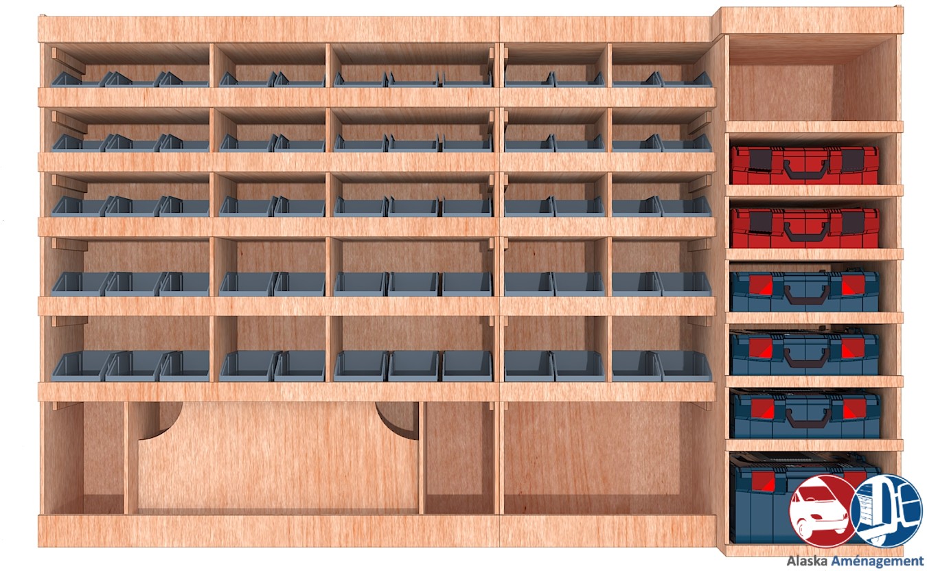 Rangement rapide avec bacs à bec et espace pour mallettes, pensé pour les artisans mobiles.
