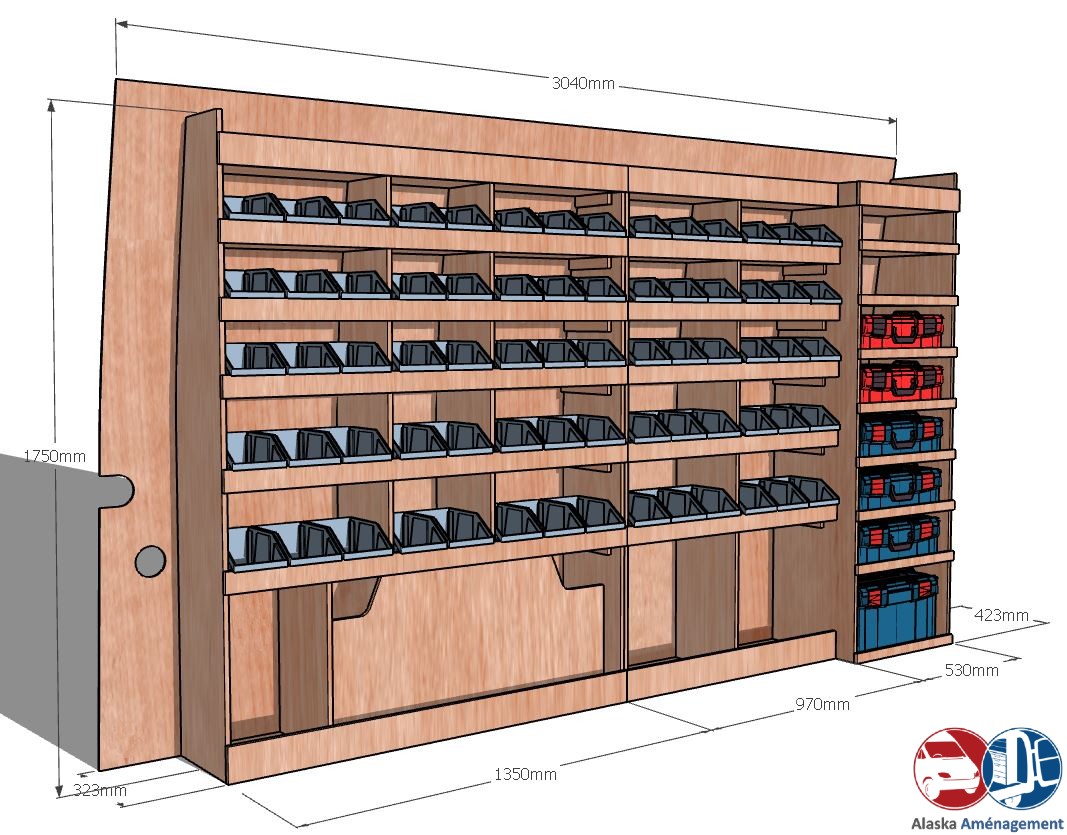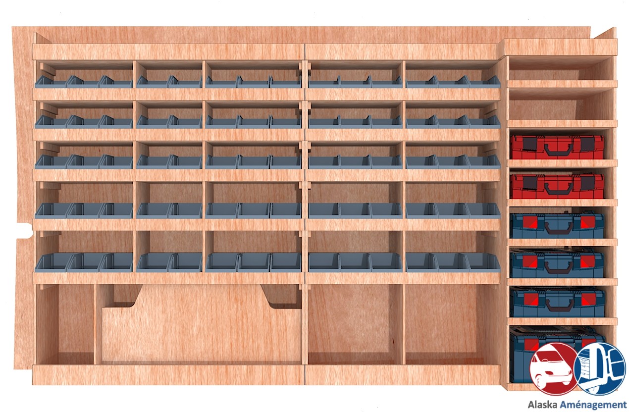 Ce meuble de rangement KRMG001-N (pour le latéral « Gauche » de votre véhicule) offre une solution de stockage polyvalente et fonctionnelle avec sept niveaux de stockage. Il comprend des étagères pour bacs à bec et un module spécifique pour les mallettes d’électroportatif. Une étagère supérieure est conçue pour les objets longs. Son fond arrière intégré assure la rigidité et protège la carrosserie du véhicule, évitant un habillage supplémentaire. Le meuble est disponible en contreplaqué brut ou filmé. |