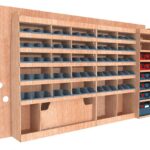 | Rangement rapide avec bacs à bec et espace pour mallettes, pensé pour les artisans mobiles.
