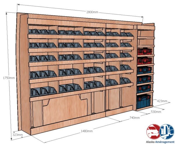 Ce meuble de rangement KRMG001-N(pour le latéral « Gauche » de votre véhicule) offre une solution de stockage polyvalente et fonctionnelle avec sept niveaux de stockage. Il comprend des étagères pour bacs à bec et un module spécifique pour les mallettes d’électroportatif. Une étagère supérieure est conçue pour les objets longs. Son fond arrière intégré assure la rigidité et protège la carrosserie du véhicule, évitant un habillage supplémentaire. Le meuble est disponible en contreplaqué brut ou filmé.