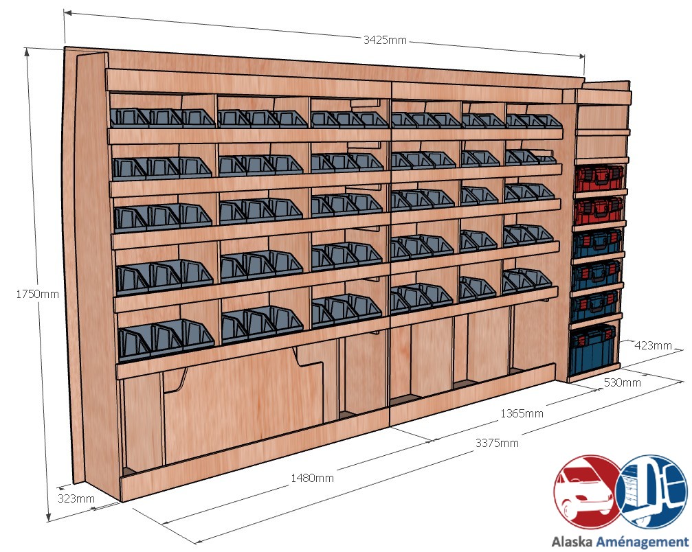 Ce meuble de rangement KRMG001-N (pour le latéral « Gauche » de votre véhicule) offre une solution de stockage polyvalente et fonctionnelle avec sept niveaux de stockage. Il comprend des étagères pour bacs à bec  et un module spécifique pour les mallettes d’électroportatif. Une étagère supérieure est conçue pour les objets longs. Son fond arrière intégré assure la rigidité et protège la carrosserie du véhicule, évitant un habillage supplémentaire. Le meuble est disponible en contreplaqué brut ou filmé.