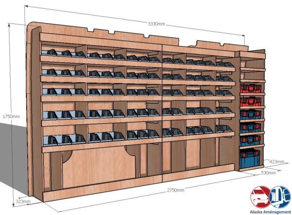 Ce meuble de rangement KRMG001-N (pour le latéral « Gauche » de votre véhicule) offre une solution de stockage polyvalente et fonctionnelle avec sept niveaux de stockage. Il comprend des étagères pour bacs à bec  et un module spécifique pour les mallettes d’électroportatif. Une étagère supérieure est conçue pour les objets longs. Son fond arrière intégré assure la rigidité et protège la carrosserie du véhicule, évitant un habillage supplémentaire. Le meuble est disponible en contreplaqué brut ou filmé.