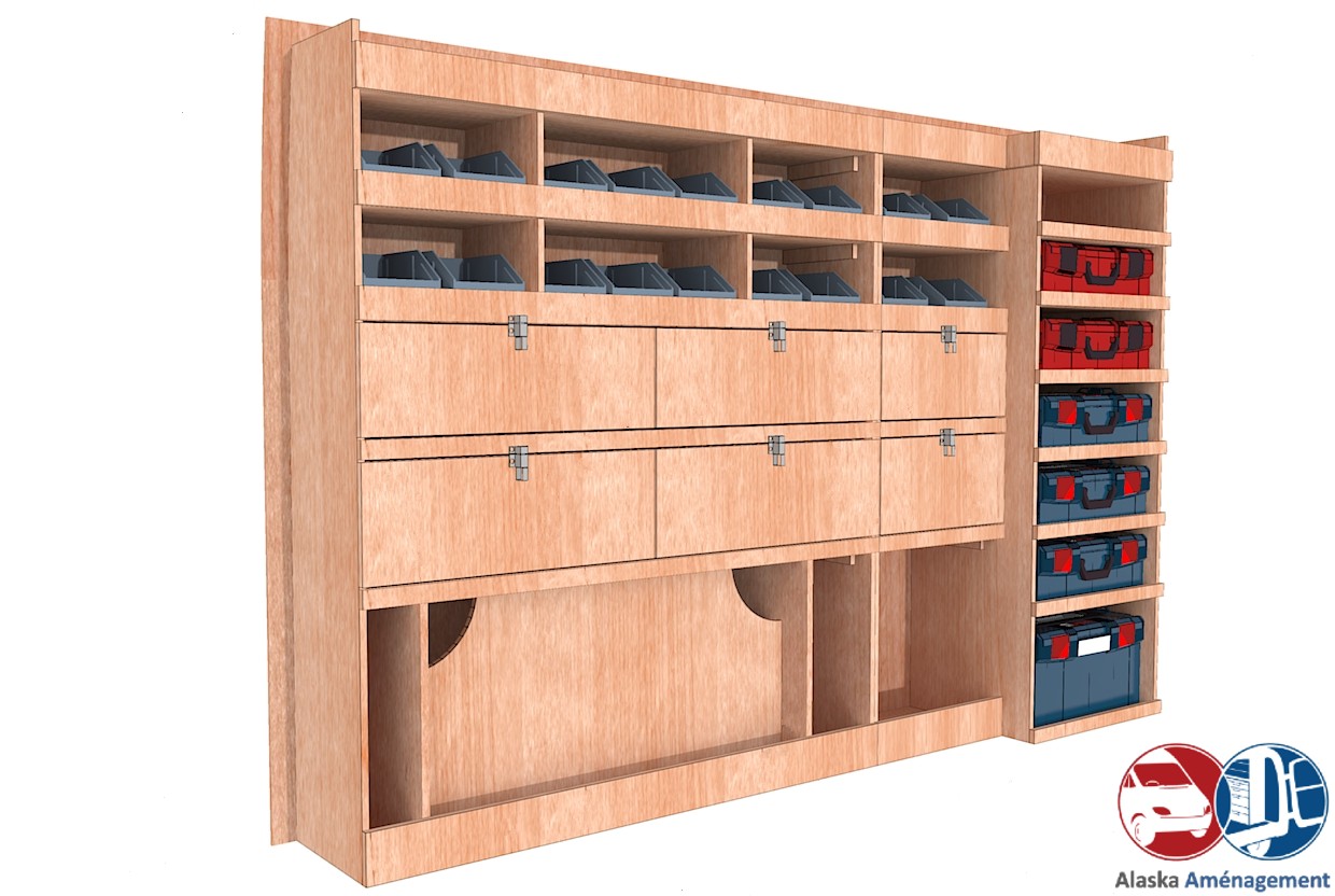 Ce meuble de rangement KRMG002-N (pour le latéral « Gauche » de votre véhicule) offre une solution de stockage polyvalente et fonctionnelle avec six niveaux de stockage. Il comprend des étagères pour bacs à bec, des clapets basculants, et un module spécifique pour les mallettes d’électroportatif. Une étagère supérieure est conçue pour les objets longs. Son fond arrière intégré assure la rigidité et protège la carrosserie du véhicule, évitant un habillage supplémentaire. Le meuble est disponible en contreplaqué brut ou filmé.
