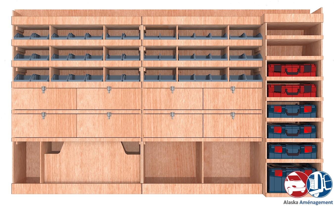 Ce meuble de rangement KRMG002-N (pour le latéral « Gauche » de votre véhicule) offre une solution de stockage polyvalente et fonctionnelle avec sept niveaux de stockage. Il comprend des étagères pour bacs à bec, des clapets basculants, et un module spécifique pour les mallettes d’électroportatif. Une étagère supérieure est conçue pour les objets longs. Son fond arrière intégré assure la rigidité et protège la carrosserie du véhicule, évitant un habillage supplémentaire. Le meuble est disponible en contreplaqué brut ou filmé.