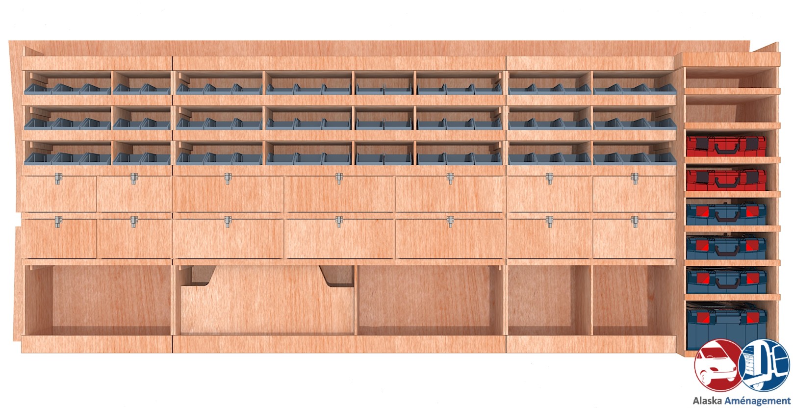 Ce meuble de rangement KRMG002-N (pour le latéral « Gauche » de votre véhicule) offre une solution de stockage polyvalente et fonctionnelle avec sept niveaux de stockage. Il comprend des étagères pour bacs à bec, des clapets basculants, et un module spécifique pour les mallettes d’électroportatif. Une étagère supérieure est conçue pour les objets longs. Son fond arrière intégré assure la rigidité et protège la carrosserie du véhicule, évitant un habillage supplémentaire. Le meuble est disponible en contreplaqué brut ou filmé.