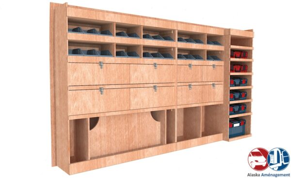 Ce meuble de rangement KRMG002-N (pour le latéral « Gauche » de votre véhicule) offre une solution de stockage polyvalente et fonctionnelle avec six niveaux de stockage. Il comprend des étagères pour bacs à bec, des clapets basculants, et un module spécifique pour les mallettes d’électroportatif. Une étagère supérieure est conçue pour les objets longs. Son fond arrière intégré assure la rigidité et protège la carrosserie du véhicule, évitant un habillage supplémentaire. Le meuble est disponible en contreplaqué brut ou filmé. |