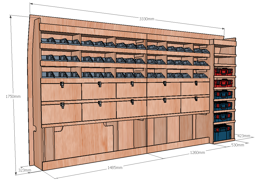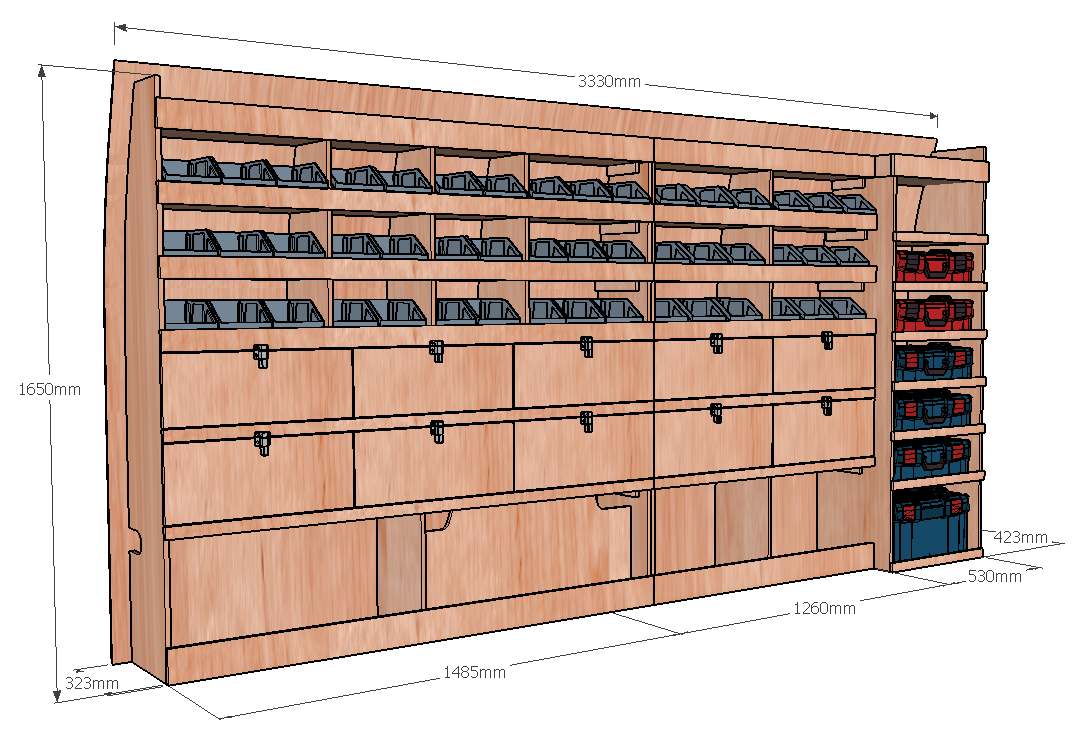 Ce meuble de rangement KRMG002-N (pour le latéral « Gauche » de votre véhicule) offre une solution de stockage polyvalente et fonctionnelle avec sept niveaux de stockage. Il comprend des étagères pour bacs à bec, des clapets basculants, et un module spécifique pour les mallettes d’électroportatif. Une étagère supérieure est conçue pour les objets longs. Son fond arrière intégré assure la rigidité et protège la carrosserie du véhicule, évitant un habillage supplémentaire. Le meuble est disponible en contreplaqué brut ou filmé. |