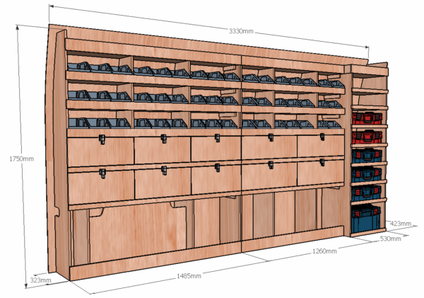 Ce meuble de rangement KRMG002-N (pour le latéral « Gauche » de votre véhicule) offre une solution de stockage polyvalente et fonctionnelle avec sept niveaux de stockage. Il comprend des étagères pour bacs à bec, des clapets basculants, et un module spécifique pour les mallettes d’électroportatif. Une étagère supérieure est conçue pour les objets longs. Son fond arrière intégré assure la rigidité et protège la carrosserie du véhicule, évitant un habillage supplémentaire. Le meuble est disponible en contreplaqué brut ou filmé.
