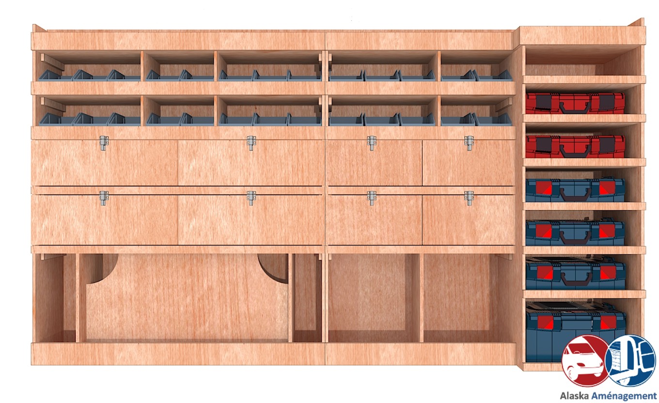 Ce meuble de rangement KRMG002-N (pour le latéral « Gauche » de votre véhicule) offre une solution de stockage polyvalente et fonctionnelle avec six niveaux de stockage. Il comprend des étagères pour bacs à bec, des clapets basculants, et un module spécifique pour les mallettes d’électroportatif. Une étagère supérieure est conçue pour les objets longs. Son fond arrière intégré assure la rigidité et protège la carrosserie du véhicule, évitant un habillage supplémentaire. Le meuble est disponible en contreplaqué brut ou filmé.
