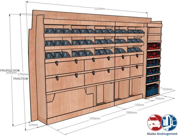 Ce meuble de rangement KRMG002-N (pour le latéral « Gauche » de votre véhicule) offre une solution de stockage polyvalente et fonctionnelle avec sept niveaux de stockage. Il comprend des étagères pour bacs à bec, des clapets basculants, et un module spécifique pour les mallettes d’électroportatif. Une étagère supérieure est conçue pour les objets longs. Son fond arrière intégré assure la rigidité et protège la carrosserie du véhicule, évitant un habillage supplémentaire. Le meuble est disponible en contreplaqué brut ou filmé. |