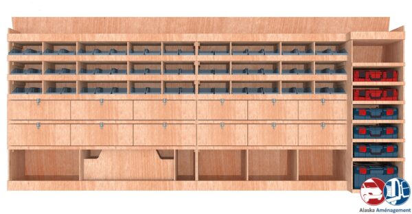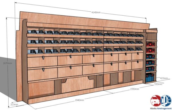 Ce meuble de rangement KRMG002-N (pour le latéral « Gauche » de votre véhicule) offre une solution de stockage polyvalente et fonctionnelle avec sept niveaux de stockage. Il comprend des étagères pour bacs à bec, des clapets basculants, et un module spécifique pour les mallettes d’électroportatif. Une étagère supérieure est conçue pour les objets longs. Son fond arrière intégré assure la rigidité et protège la carrosserie du véhicule, évitant un habillage supplémentaire. Le meuble est disponible en contreplaqué brut ou filmé. |