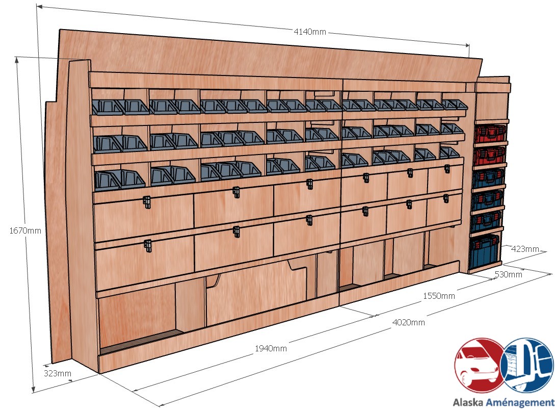 Ce meuble de rangement KRMG002-N (pour le latéral « Gauche » de votre véhicule) offre une solution de stockage polyvalente et fonctionnelle avec sept niveaux de stockage. Il comprend des étagères pour bacs à bec, des clapets basculants, et un module spécifique pour les mallettes d’électroportatif. Une étagère supérieure est conçue pour les objets longs. Son fond arrière intégré assure la rigidité et protège la carrosserie du véhicule, évitant un habillage supplémentaire. Le meuble est disponible en contreplaqué brut ou filmé.