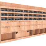 Ce meuble de rangement KRMG002-N (pour le latéral « Gauche » de votre véhicule) offre une solution de stockage polyvalente et fonctionnelle avec sept niveaux de stockage. Il comprend des étagères pour bacs à bec, des clapets basculants, et un module spécifique pour les mallettes d’électroportatif. Une étagère supérieure est conçue pour les objets longs. Son fond arrière intégré assure la rigidité et protège la carrosserie du véhicule, évitant un habillage supplémentaire. Le meuble est disponible en contreplaqué brut ou filmé.