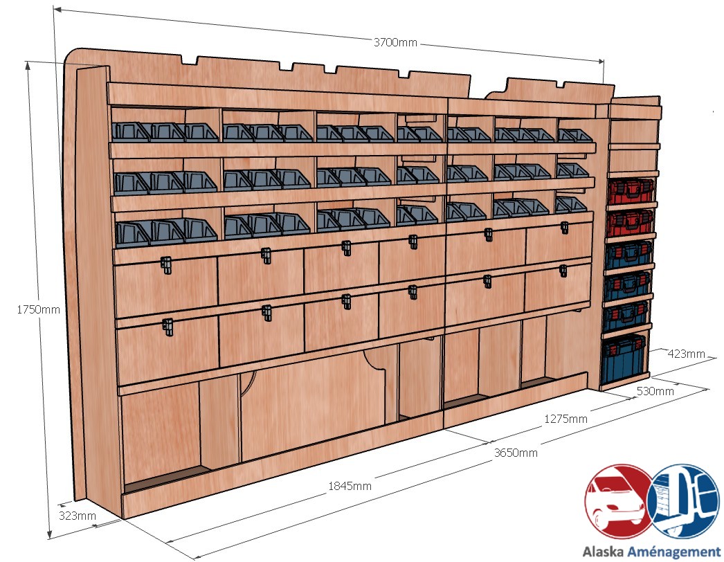 Ce meuble de rangement KRMG002-N (pour le latéral « Gauche » de votre véhicule) offre une solution de stockage polyvalente et fonctionnelle avec sept niveaux de stockage. Il comprend des étagères pour bacs à bec, des clapets basculants, et un module spécifique pour les mallettes d’électroportatif. Une étagère supérieure est conçue pour les objets longs. Son fond arrière intégré assure la rigidité et protège la carrosserie du véhicule, évitant un habillage supplémentaire. Le meuble est disponible en contreplaqué brut ou filmé. |