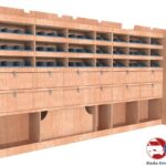 Ce meuble de rangement KRMG002-N (pour le latéral « Gauche » de votre véhicule) offre une solution de stockage polyvalente et fonctionnelle avec sept niveaux de stockage. Il comprend des étagères pour bacs à bec, des clapets basculants, et un module spécifique pour les mallettes d’électroportatif. Une étagère supérieure est conçue pour les objets longs. Son fond arrière intégré assure la rigidité et protège la carrosserie du véhicule, évitant un habillage supplémentaire. Le meuble est disponible en contreplaqué brut ou filmé.
