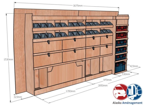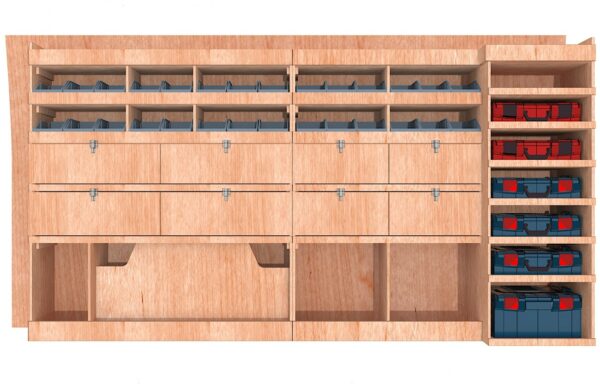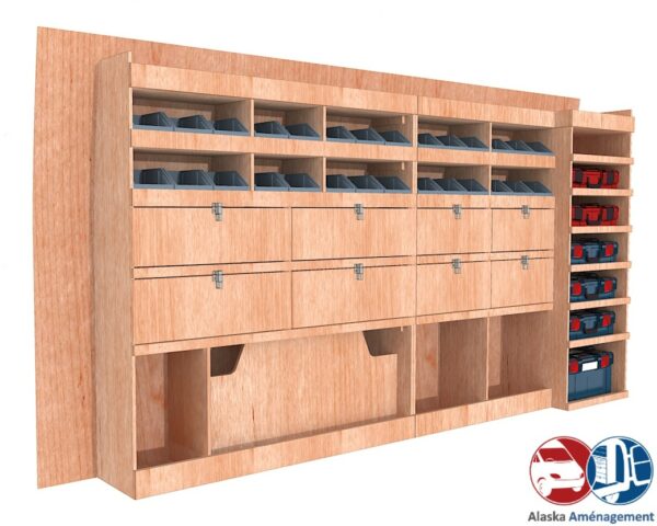 Ce meuble de rangement KRMG002-N (pour le latéral « Gauche » de votre véhicule) offre une solution de stockage polyvalente et fonctionnelle avec six niveaux de stockage. Il comprend des étagères pour bacs à bec, des clapets basculants, et un module spécifique pour les mallettes d’électroportatif. Une étagère supérieure est conçue pour les objets longs. Son fond arrière intégré assure la rigidité et protège la carrosserie du véhicule, évitant un habillage supplémentaire. Le meuble est disponible en contreplaqué brut ou filmé. |