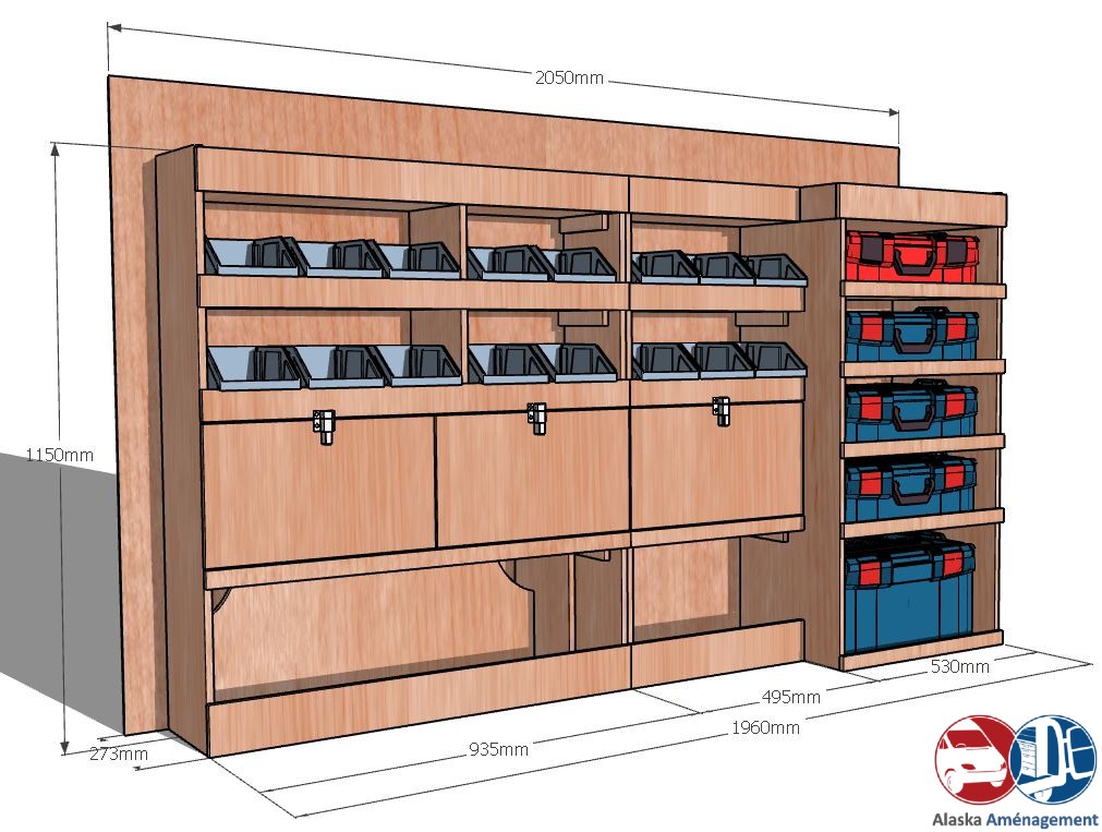 Ce meuble de rangement KRMG002-N (pour le latéral « Gauche » de votre véhicule) offre une solution de stockage polyvalente et fonctionnelle avec cinq niveaux de stockage. Il comprend des étagères pour bacs à bec, des clapets basculants, et un module spécifique pour les mallettes d’électroportatif. Une étagère supérieure est conçue pour les objets longs. Son fond arrière intégré assure la rigidité et protège la carrosserie du véhicule, évitant un habillage supplémentaire. Le meuble est disponible en contreplaqué brut ou filmé.