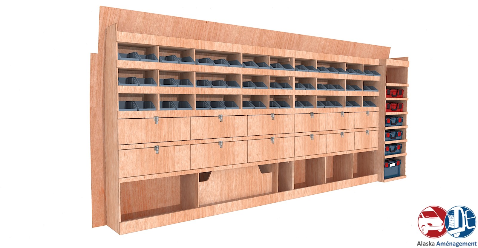 Ce meuble de rangement KRMG002-N (pour le latéral « Gauche » de votre véhicule) offre une solution de stockage polyvalente et fonctionnelle avec sept niveaux de stockage. Il comprend des étagères pour bacs à bec, des clapets basculants, et un module spécifique pour les mallettes d’électroportatif. Une étagère supérieure est conçue pour les objets longs. Son fond arrière intégré assure la rigidité et protège la carrosserie du véhicule, évitant un habillage supplémentaire. Le meuble est disponible en contreplaqué brut ou filmé.