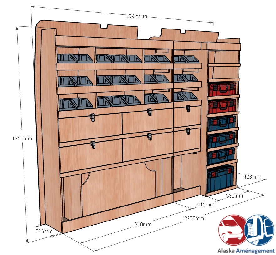 Ce meuble de rangement KRMG002-N (pour le latéral « Gauche » de votre véhicule) offre une solution de stockage polyvalente et fonctionnelle avec six niveaux de stockage. Il comprend des étagères pour bacs à bec, des clapets basculants, et un module spécifique pour les mallettes d’électroportatif. Une étagère supérieure est conçue pour les objets longs. Son fond arrière intégré assure la rigidité et protège la carrosserie du véhicule, évitant un habillage supplémentaire. Le meuble est disponible en contreplaqué brut ou filmé. |