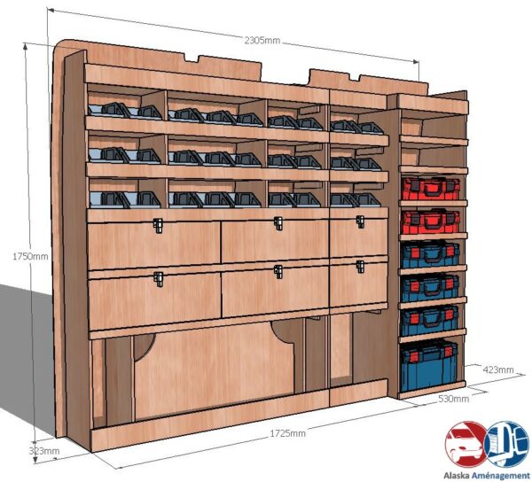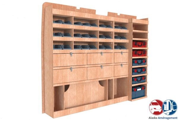 Ce meuble de rangement KRMG002-N (pour le latéral « Gauche » de votre véhicule) offre une solution de stockage polyvalente et fonctionnelle avec six niveaux de stockage. Il comprend des étagères pour bacs à bec, des clapets basculants, et un module spécifique pour les mallettes d’électroportatif. Une étagère supérieure est conçue pour les objets longs. Son fond arrière intégré assure la rigidité et protège la carrosserie du véhicule, évitant un habillage supplémentaire. Le meuble est disponible en contreplaqué brut ou filmé.