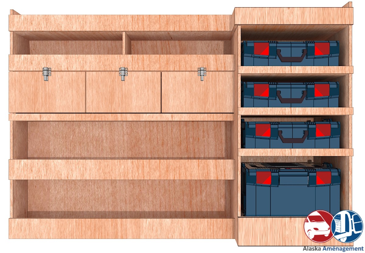 Ce meuble de rangement KRMG002-N (pour le latéral « Gauche » de votre véhicule) offre une solution de stockage polyvalente et fonctionnelle avec cinq niveaux de stockage. Il comprend des étagères standards, des clapets basculants, et un module spécifique pour les mallettes d’électroportatif. Son fond arrière intégré assure la rigidité et protège la carrosserie du véhicule, évitant un habillage supplémentaire. Le meuble est disponible en contreplaqué brut ou filmé.