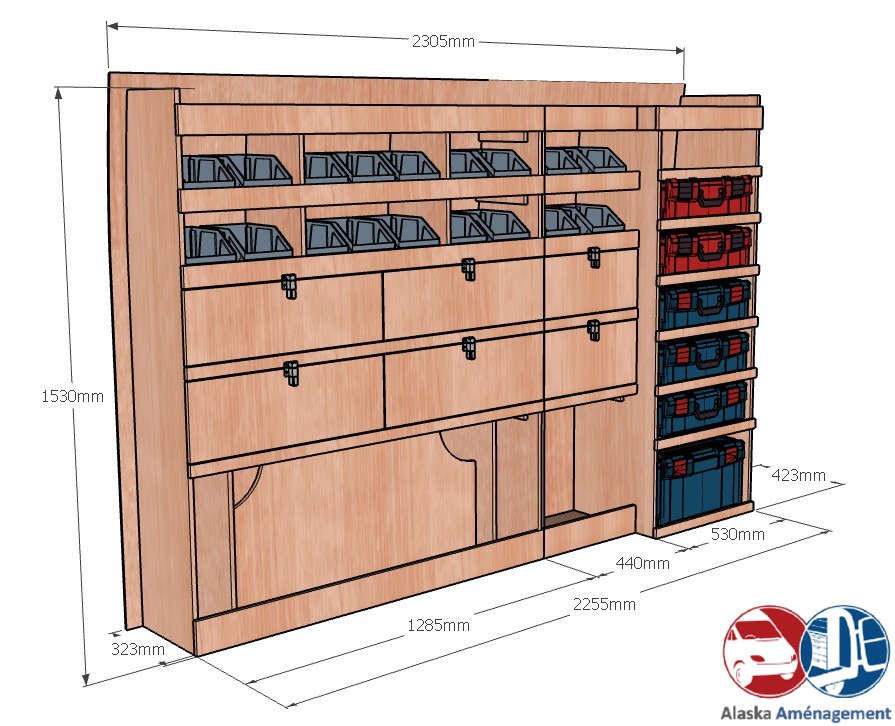 Ce meuble de rangement KRMG002-N (pour le latéral « Gauche » de votre véhicule) offre une solution de stockage polyvalente et fonctionnelle avec six niveaux de stockage. Il comprend des étagères pour bacs à bec, des clapets basculants, et un module spécifique pour les mallettes d’électroportatif. Une étagère supérieure est conçue pour les objets longs. Son fond arrière intégré assure la rigidité et protège la carrosserie du véhicule, évitant un habillage supplémentaire. Le meuble est disponible en contreplaqué brut ou filmé. |