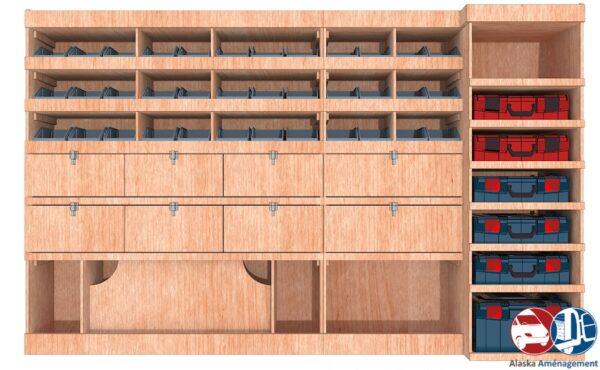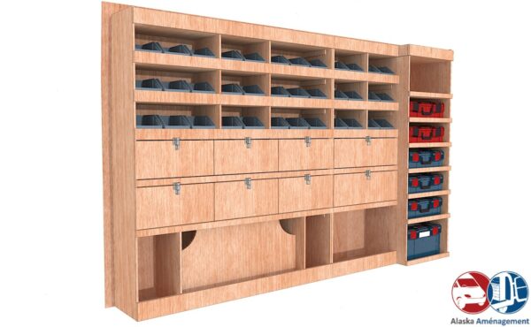 Ce meuble de rangement KRMG002-N (pour le latéral « Gauche » de votre véhicule) offre une solution de stockage polyvalente et fonctionnelle avec sept niveaux de stockage. Il comprend des étagères pour bacs à bec, des clapets basculants, et un module spécifique pour les mallettes d’électroportatif. Une étagère supérieure est conçue pour les objets longs. Son fond arrière intégré assure la rigidité et protège la carrosserie du véhicule, évitant un habillage supplémentaire. Le meuble est disponible en contreplaqué brut ou filmé.